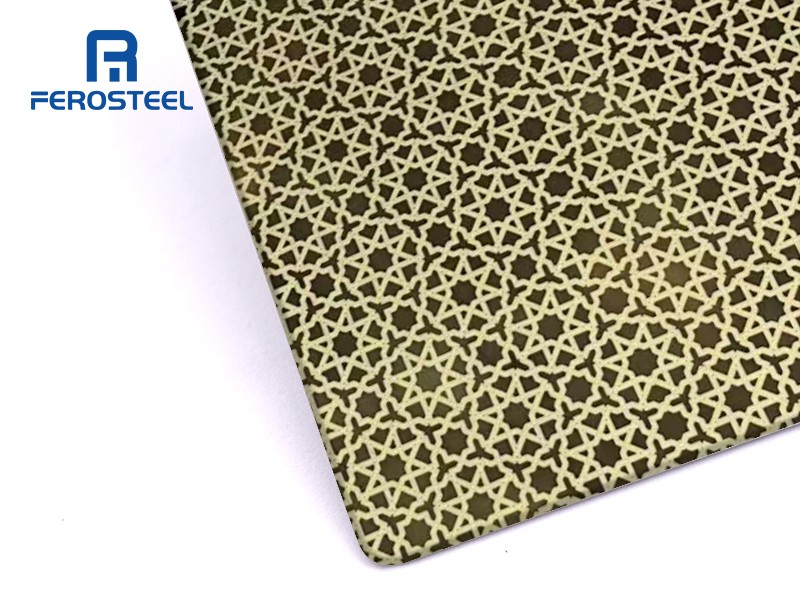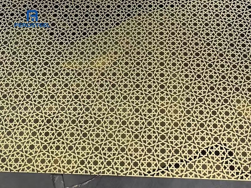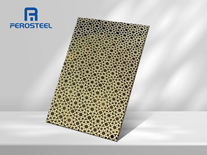 The Geometric Etched Stainless Steel Sheet is a high-end decorative panel featuring a refined and repetitive geometric pattern, created through advanced chemical etching technology. The design shown presents a dense star-like lattice structure, delivering a modern, elegant, and luxurious visual effect.